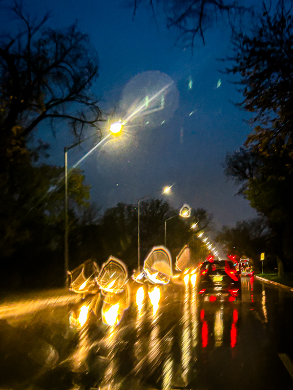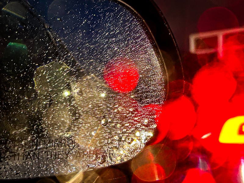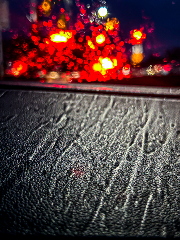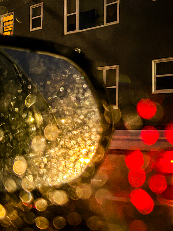 I recently experimented with out of focus shapes, shadows, rain and street lights. The moment happened spontaneously while I was a passenger in the car. It took about 5-10 minutes and afterwards I felt satisfied.